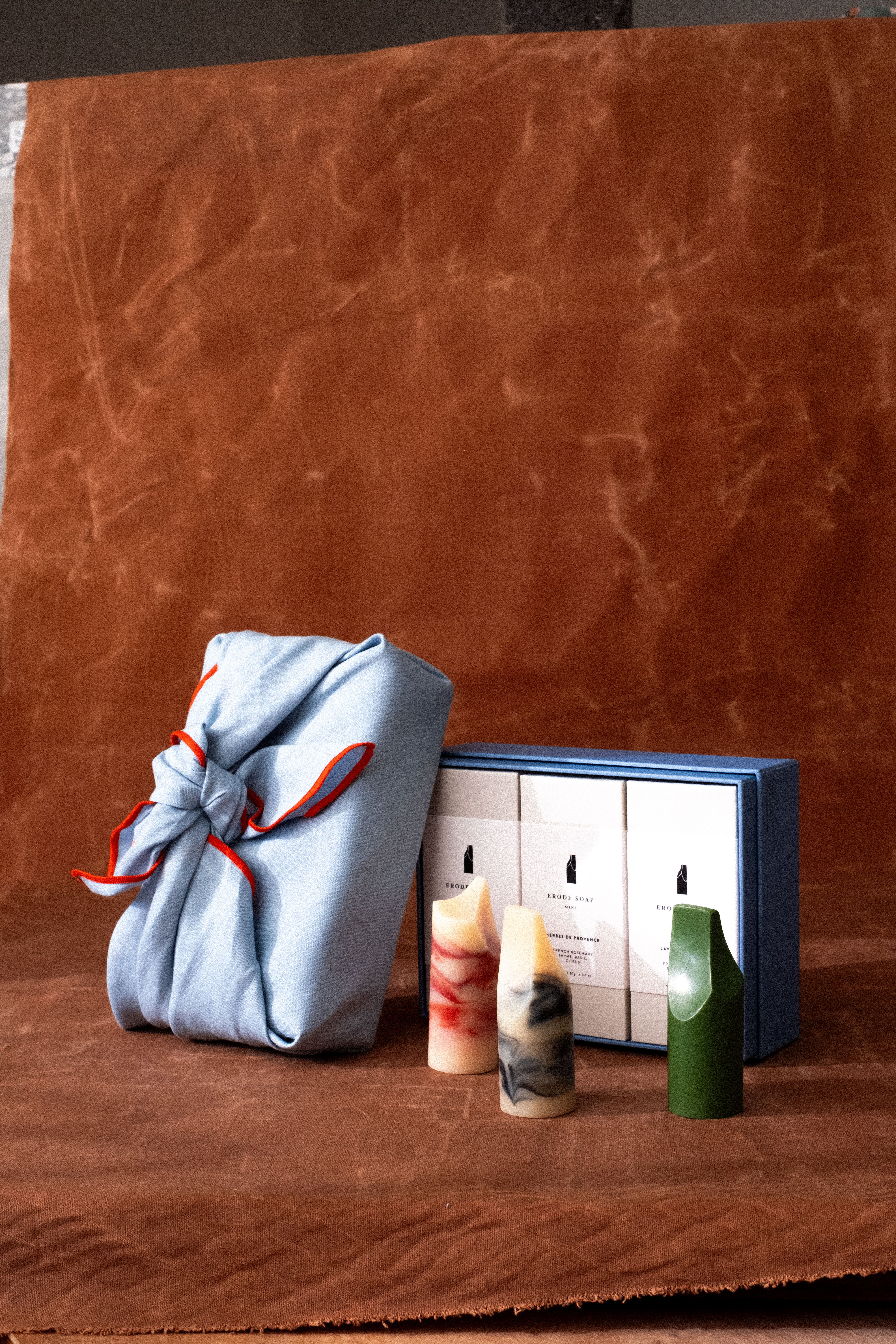 Three individually boxed Mini Erode soaps presented in our trademark blue gift box. This gift is the perfect hostess offering, white elephant gift, and thank-you set. Everyone can use a soap.